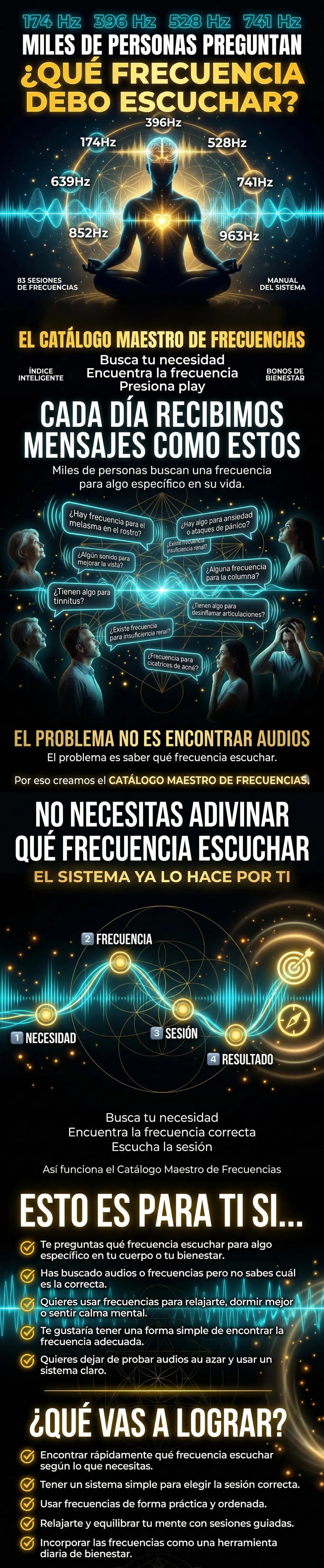 83 sesiones de frecuencias · Manual del sistema en 5 secciones · Bonos incluidos · Nuevas sesiones añadidas cada mes